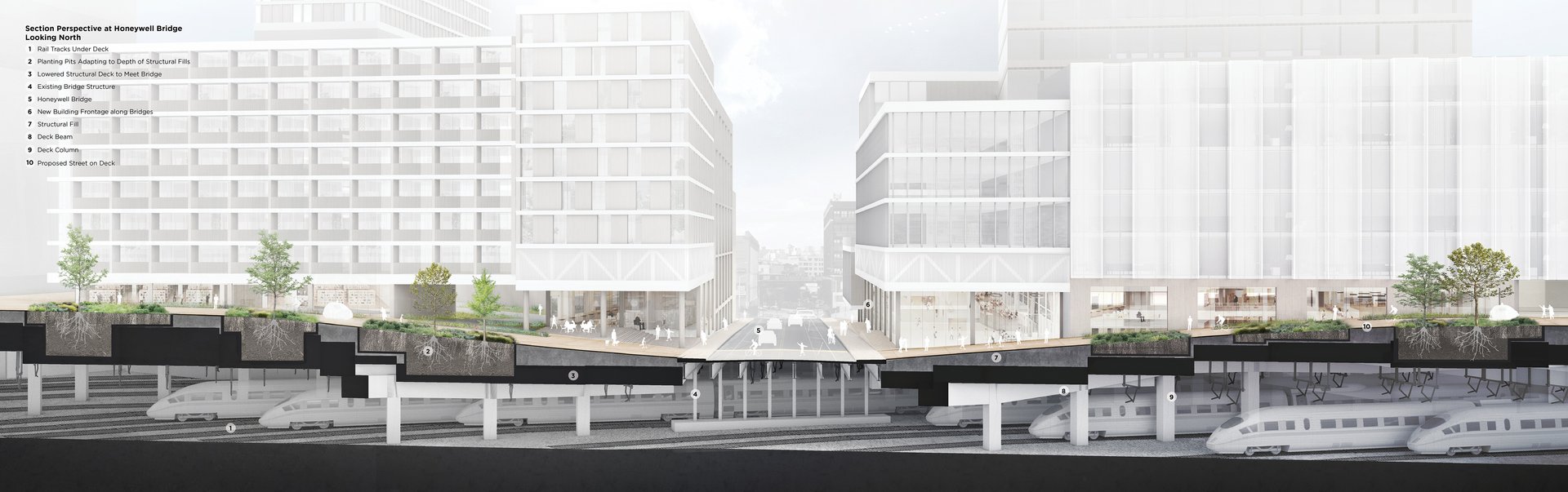 The Master Plan proposes to deck over 80 percent of the Yard. The rest—primarily the Main Line tracks—is left open due to rail activity and track layouts that make decking these areas infeasible. Through this process we learned: